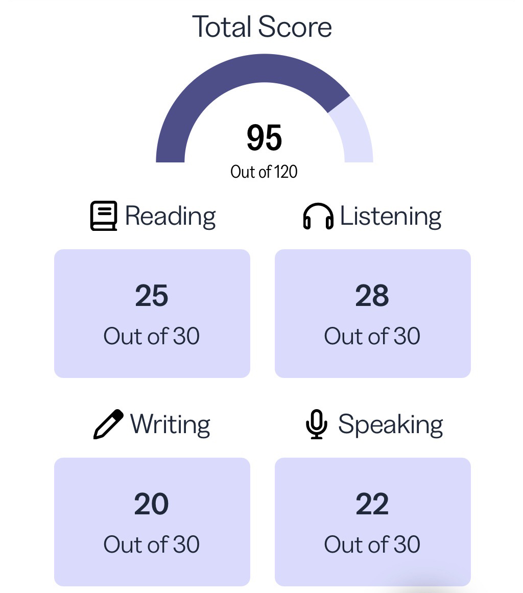 トータル95点/120点、リーディング25点/30点、リスニング28点/30点、スピーキング22点/30点、ライティング20点/30点