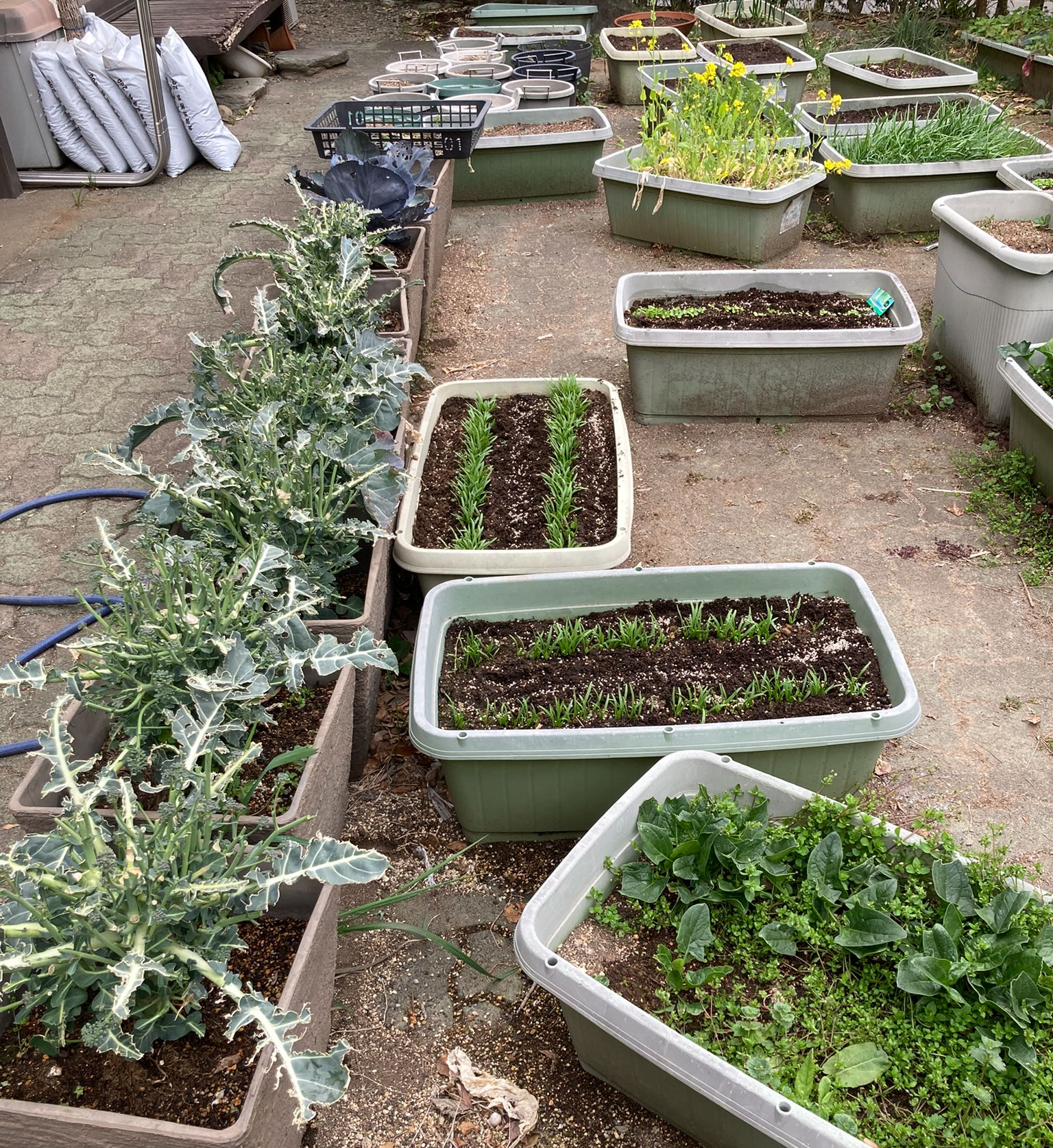 右の一番手前は雑草まみれのほうれん草。手前から2つめと3つめのプランターはほうれん草の芽が出たところ。
